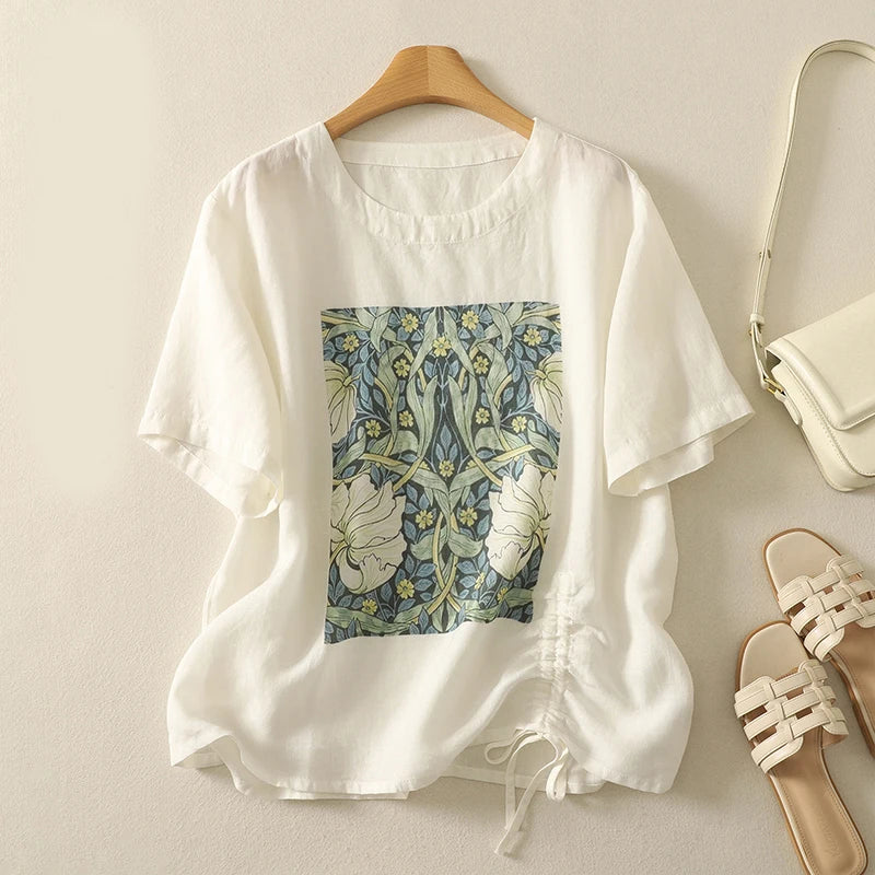 A breath of calm in your closet. The Alina Garden Top is crafted from a lightweight linen blend, designed with a botanical centerpiece and side drawstring detail that adds just the right shape. Perfect for sunny mornings, slow weekends, or whenever you need softness and beauty in your day.