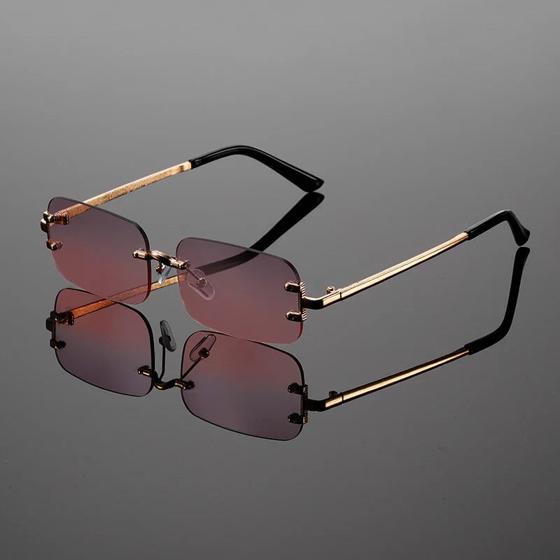 Looking for the perfect shades? These rimless sunglasses feature rectangular lenses, a metallic bridge with a double-bar detail, and adjustable nose pads—perfect for those who love luxury.