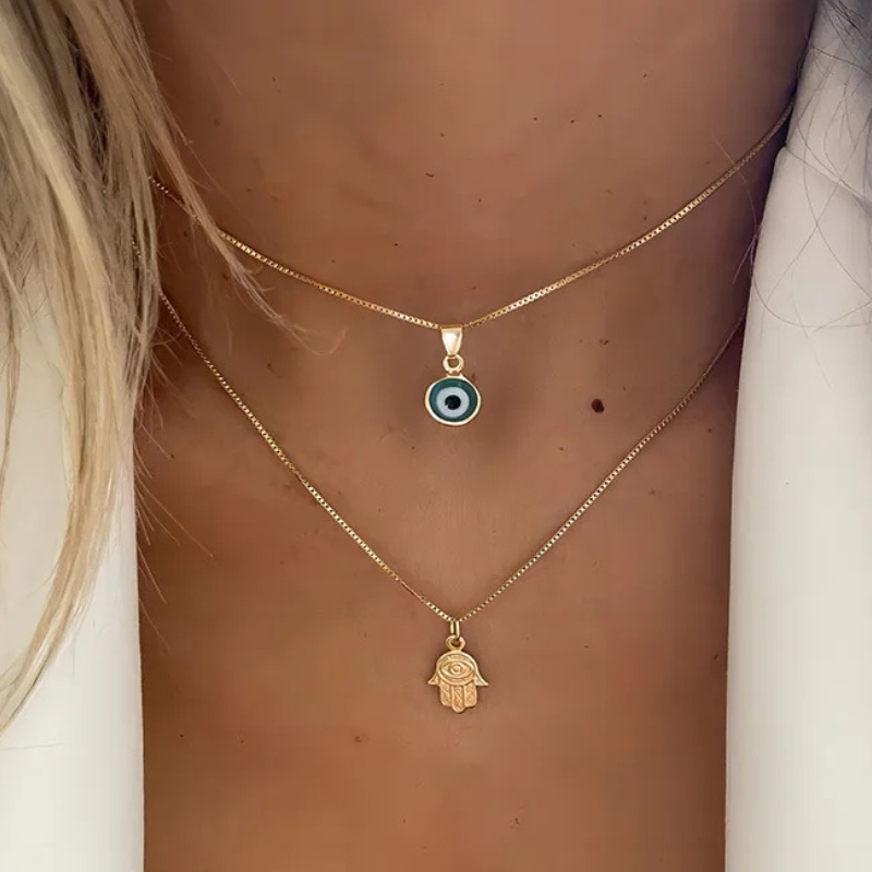 A symbol of protection and grace, this layered necklace pairs the all-seeing evil eye with the Hamsa hand to guard your energy and amplify inner strength. Crafted with sleek stainless chains that are scratch-resistant and built never to fade, it’s the kind of piece you wear like a second skin—every day, everywhere. More than jewelry, it’s your quiet power in plain sight.