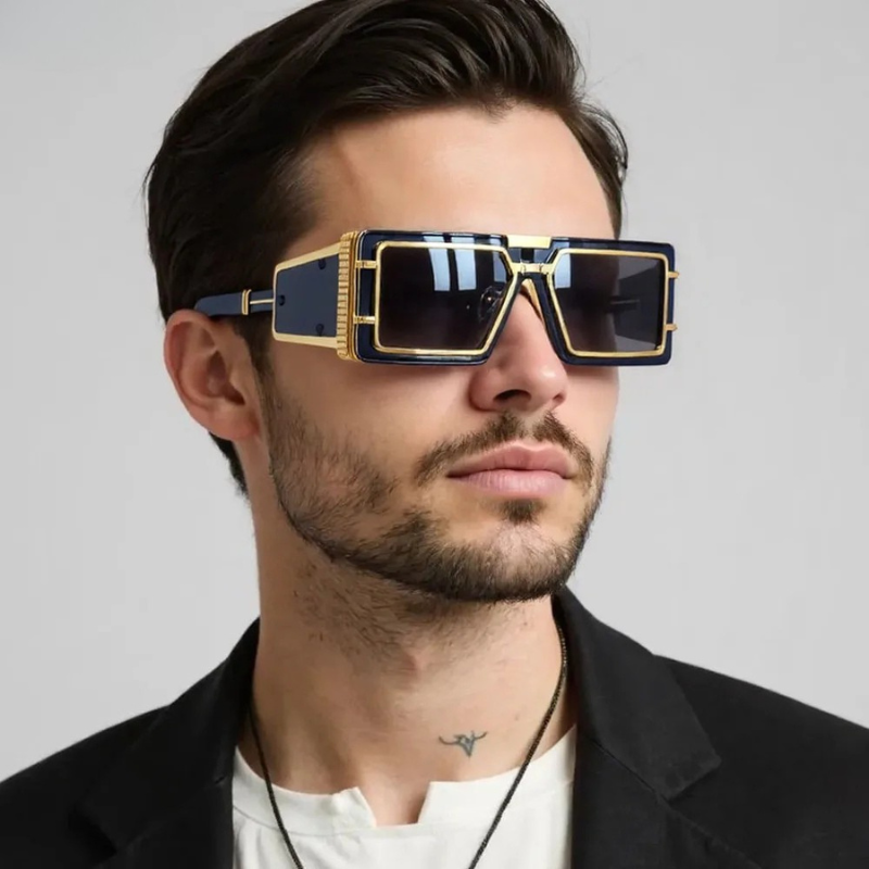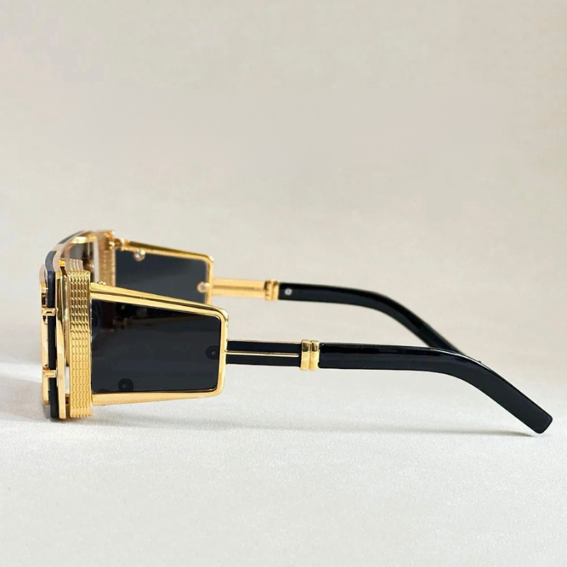 For the ones who turn heads without trying. These statement shades bring a bold, high-fashion edge with their oversized geometric frame and sleek side shields. The gold details hit just right, while tinted lenses keep your vibe untouchable.