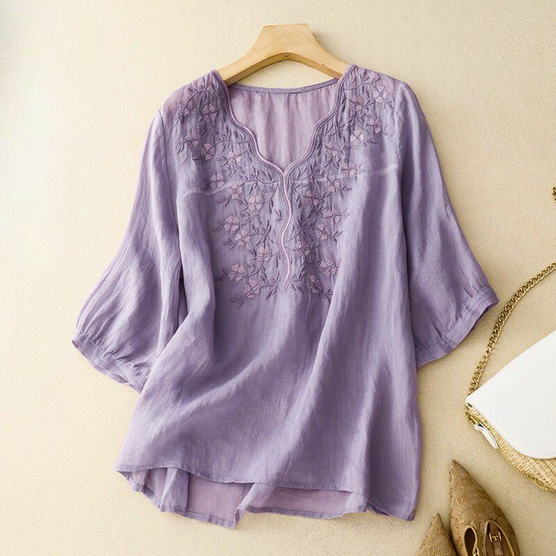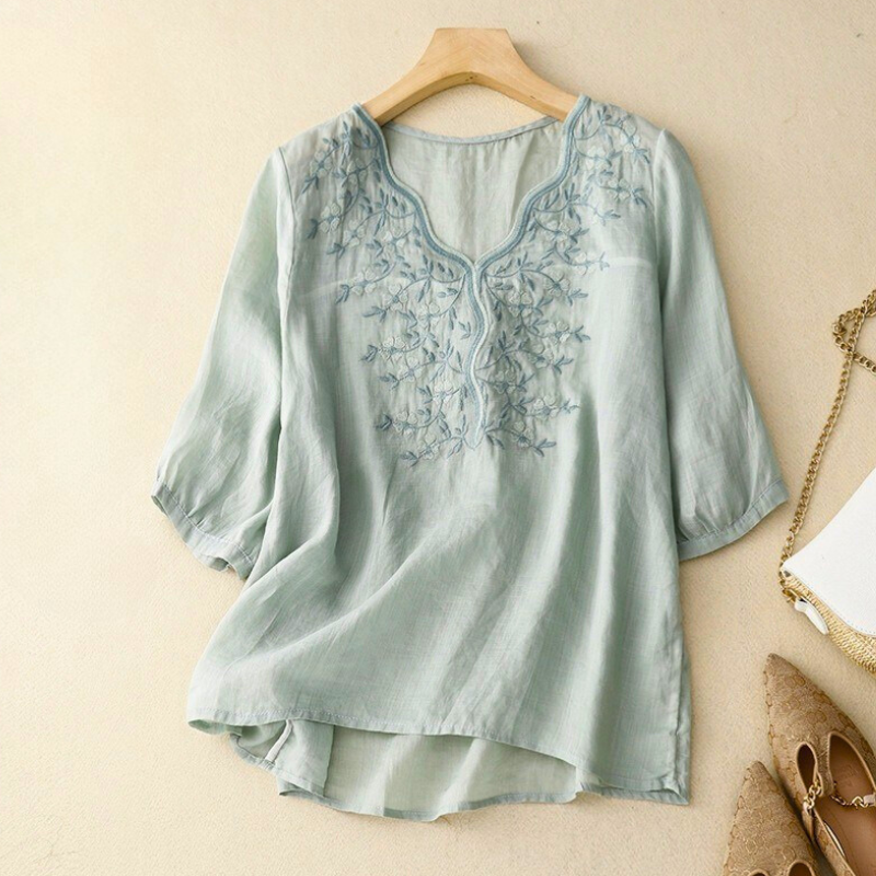 Timeless grace with a delicate twist. The Rosa Fiore Blouse is crafted from our signature linen blend, featuring soft embroidery, a flowing silhouette, and a refined neckline made to flatter. It’s that piece you reach for when you want to feel feminine, put-together, and quietly confident—perfect for garden brunches, gallery strolls, or slow mornings with coffee in hand.